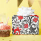 Wrapping paper in a vintage William Morris floral print of stylized lilies and Irises, digitally enhanced and colored, in shades of gray / grey and black foliage, with deep red flowers,on a white background