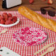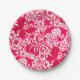 Paper plates in a vintage William Morris floral print of stylised lilies and Irises, digitally enhanced and coloured, in shades of light to deep fuchsia pink and deep wine red on a white background
