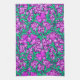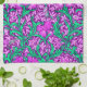 Kitchen towel in a William Morris, Art Nouveau, textile print of irises and leaves, digitally enhanced and coloured, in soft orchid and turquoise, on a deep amethyst purple background