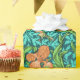 Wrapping paper in a William Morris, Art Nouveau, textile print of irises and leaves, digitally enhanced and coloured, in orange, lime green, and soft aqua, on a deep turquoise background