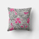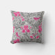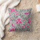 Throw pillow in a William Morris, Art Nouveau, textile print of irises and leaves, digitally enhanced and colored, in fuchsia and light pink, with graphite and medium gray / grey leaves, on a light silver gray background