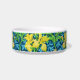Pet bowl in a William Morris, Art Nouveau, textile print of irises and leaves, digitally enhanced and coloured, in golden yellow, green, and soft blue, on a deep cobalt blue background