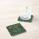 Coasters in a vintage William Morris Jacobean floral wallpaper pattern of coral pink tulips, yellow daisies, blue violets, delicate white blossoms, and jade green foliage, on a black background, digitally enhanced and coloured