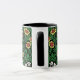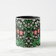 Mug in a vintage William Morris Jacobean floral wallpaper pattern of coral pink tulips, yellow daisies, blue violets, delicate white blossoms, and jade green foliage, on a black background, digitally enhanced and coloured