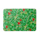 Bath mat in a William Morris Art Nouveau textile pattern of lychee tree branches and leaves, in shades of lime and deep green, accented with red lychee fruits and yellow blossoms, on a light green background