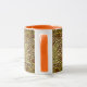 Mug in a vintage William Morris, Art Nouveau, marigold damask print of leaves and flowers, in shades of copper brown and mustard gold, accented with orange and yellow, on a dark chocolate brown background