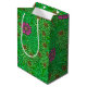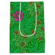 Gift bag in a vintage William Morris, Art Nouveau, marigold damask print of leaves and flowers, digitally enhanced and coloured, in deep emerald and lime green, accented with fuchsia pink and coral orange, on a dark green background