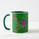 Mug in a vintage William Morris, Art Nouveau, marigold damask print of leaves and flowers, in deep emerald and lime green, accented with fuchsia pink and coral orange, on a dark green background