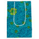 Gift bag in a vintage William Morris, Art Nouveau, marigold damask print of leaves and flowers, digitally enhanced and coloured, in shades of turquoise, aqua, and cobalt blue, accented with yellow and lime green, on a dark navy blue background
