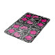 Bath mat in a vintage William Morris textile pattern of stylised pimpernel flowers and leaves - flowers in a gradient of deep to light fuchsia pink, with light silver grey / grey leaves, on a black background