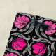 Beach towel in a vintage William Morris textile pattern of stylised pimpernel flowers and leaves - flowers in a gradient of deep to light fuchsia pink, with light silver grey / grey leaves, on a black background