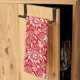 Kitchen towel in a vintage William Morris, Art Nouveau, floral print of stylised sunflowers, digitally enhanced and coloured, in deep Chinese red and white, accented with light coral