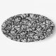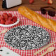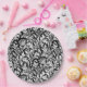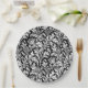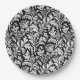 Paper plates in a vintage William Morris damask pattern of thistle flowers and leaves, in white, on a black background, digitally enhanced and coloured
