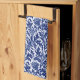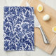Kitchen towel in a vintage William Morris damask pattern of thistle flowers and leaves, in deep cobalt blue, on a white background, digitally enhanced and coloured