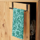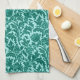 Kitchen towel in a vintage William Morris damask pattern of thistle flowers and leaves, in turquoise / peacock blue, on a light aqua background, digitally enhanced and coloured