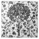 Ceramic tile in a William Morris Art Nouveau take on a traditional "tree of life" pattern, featuring fantasy trees surrounded by branches filled with exotic flowers and birds, black and shades of grey / grey, on a white background