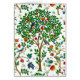 Note card in a William Morris Art Nouveau take on a traditional "tree of life" pattern, featuring fantasy trees surrounded by branches filled with exotic flowers and birds, shades of emerald green, tan, gold, red, and turquoise blue, on a white background