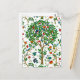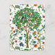Postcard in a William Morris Art Nouveau take on a traditional "tree of life" pattern, featuring fantasy trees surrounded by branches filled with exotic flowers and birds, shades of emerald green, tan, gold, red, and turquoise blue, on a white background