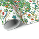 Wrapping paper in a William Morris Art Nouveau take on a traditional "tree of life" pattern, featuring fantasy trees surrounded by branches filled with exotic flowers and birds, shades of emerald green, tan, gold, red, and turquoise blue, on a white background