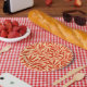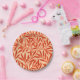 Paper plates in a William Morris Art Nouveau textile pattern of stylised willow branches and leaves in shades of mandarin orange on a pastel orange background
