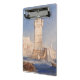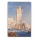 Rhodes. Joseph Mallord William Turner (1775 – 1851). A lovely seascape in pink and blue tones. In the foreground are boats and ships in the bay near the city walls. in the middle ground there is a high tower. In the background there is a city with stone houses. Reproduction of famous works of art images in the public domain.