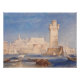 Rhodes. Joseph Mallord William Turner (1775 – 1851). A lovely seascape in pink and blue tones. In the foreground are boats and ships in the bay near the city walls. in the middle ground there is a high tower. In the background there is a city with stone houses. Reproduction of famous works of art images in the public domain.