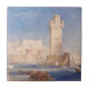 Rhodes. Joseph Mallord William Turner (1775 – 1851). A lovely seascape in pink and blue tones. In the foreground are boats and ships in the bay near the city walls. in the middle ground there is a high tower. In the background there is a city with stone houses. Reproduction of famous works of art images in the public domain.