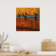 Willows at Sunset by Vincent van Gogh is a vintage fine art post impressionism landscape nature painting. A glowing sun is setting behind a field of tall grass and a grove of pollard willow trees at sunset during the hot summer days. Beautiful autumn colours in warm tones of golden yellows, oranges and reds.