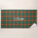 Stylish beach towel done in the classic orange and green Scottish clan Wilson tartan plaid pattern. Personalise the large white text, in the middle, to suit your needs.