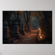 Painting of a long cobblestone path through a forested valley in fall as the sun is setting. Ancient monuments line the stone path now covered with fall leaves. On the other side of the path are candles to light the way through the woods.