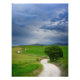 Photo print of a winding white dirt road (strada bianca) through the rolling green hills of Val d'Orcia valley landscape in Tuscany, Italy under dark clouds in the sky.