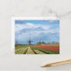 Postcard of a landscape with a windmill and yellow and red tulips under a cloudy sky in the Dutch countryside on a beautiful springtime day in the Bulb Region, the Netherlands.