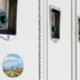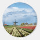 Round photo magnet with a landscape with a windmill and yellow and red tulips under a cloudy sky in the Dutch countryside on a beautiful springtime day in the Bulb Region, the Netherlands.