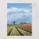 Vertical postcard of a landscape with a windmill and yellow and red tulips under a cloudy sky in the Dutch countryside on a beautiful springtime day in the Bulb Region, the Netherlands.