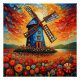 A.I. created print of a colorful windmill stands amidst rolling fields as a winding path leads through the lush landscape beneath the surreal sky and the setting sun.