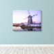 Canvas landscape print of a windmill during a purple sunrise in winter with a thin layer of snow and ice on the water at the UNESCO world heritage site Kinderdijk in the Netherlands.