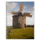 Featuring an old style windmill, used to grind grain into flour, in a bright green field in wonderful weather.