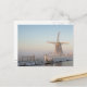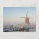 Postcard of a traditional dutch windmill covered in snow in a rural landscape in Aarlanderveen, the Netherlands, in winter in the warm early morning light at sunrise.