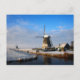 Photo postcard of a windmill next to a small river in the sunlight of a cold winter morning in a dutch countryside landscape with snow in the Netherlands.