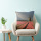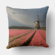 Photo throw pillow cushion with a landscape with a windmill and pink tulip flowers in rows on a bulb farm under a grey sky in the countryside in the Netherlands in spring.