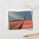 Postcard of a landscape with a windmill and pink tulip flowers in rows on a bulb farm under a grey sky in the countryside in the Netherlands in spring with a white edge and in white the text 'Holland'. The photo is a bit rotated to create the illusion of it laying loose.
