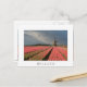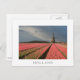 Postcard of a landscape with a windmill and pink tulip flowers in rows on a bulb farm under a grey sky in the countryside in the Netherlands in spring with a white border and the text 'Holland'.