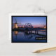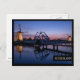 Postcard of two illuminated windmills and a drawbridge with reflection in the water of the canal in the last light at sunset in Kinderdijk in the Netherlands with a black edge and the text: 'Netherlands'.