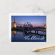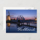 Postcard of two illuminated windmills and a drawbridge with reflection in the water of the canal in the last light at sunset in Kinderdijk in the Netherlands with the text: 'Holland'.