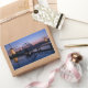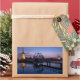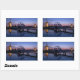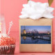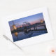 Rectangular photo sticker of two illuminated windmills and a drawbridge with reflection in the water of the canal in the last light at sunset in Kinderdijk in the Netherlands.
