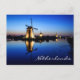 Postcard of historic windmills illuminated at dusk during the Blue Hour with reflection in the water in a landscape in Kinderdijk, the Netherlands with the text: 'Netherlands'.