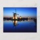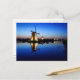 Postcard of historic windmills illuminated at dusk during the Blue Hour with reflection in the water in a landscape in Kinderdijk, the Netherlands.