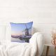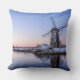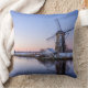Throw pillow with a sunrise over the windmills of Kinderdijk in the Netherlands in winter with some snow and ice on the water.