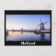 Postcard of a sunrise over the windmills of Kinderdijk in the Netherlands in winter with some snow and ice on the water.