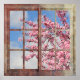 Window scene with Cherry Blossom Tree of pretty pink flowers and blue skies with fluffy clouds taken in spring with faux window frame to add the sense of bringing the outdoors inside.